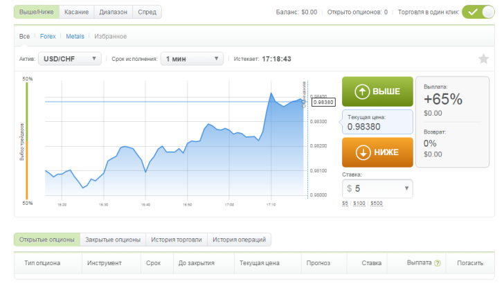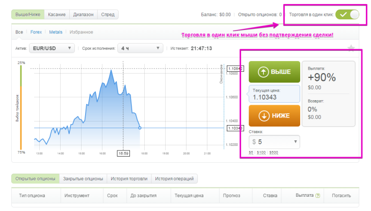 После того как вы решили в какую сторону пойдет цена в правой части платформы вы можете выбрать действие «выше» или «ниже» а так же выбрать размер ставки, которой вы готовы рискнуть. Особенностью компании является то, что чем больше период окончания опциона вы поставите, тем больше процент от выигрыша будет составлять. Так, например, на паре евро/доллар за опцион сроком в 1 минуту компания готова дать вам 65 процентов от ставки в случае победы, а за опцион сроком в 4 часа 90 процентов прибыли от размера ставки. Обычно все брокерские компании делают с точностью да наоборот. Процент выплаты вы можете увидеть в правом углу платформы, причем на каждом типе опционов он немного отличается. Так же компания реализовала возможность открытия позиции в один клик мыши, без какого либо подтверждения. Включить или выключить этот режим вы можете в правом углу торговой платформы, перетянувши бегунок в необходимое положение.