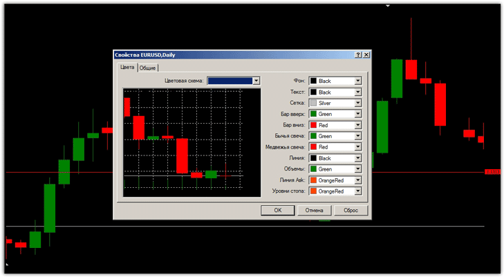 Стратегия на свечах "Красные и Зеленые свечи" Множество людей, которые хотели бы попробовать себя на бирже в качестве трейдера и получить дополнительный доход, как правило, отказываются от своей затеи из-за отсутствия времени. Согласитесь, человек, который обладает бизнесом или стабильной работой, не может вот так все бросить и смотреть сутками за графиками и изучать книги по биржевой литературе. Также не стоит отбрасывать тот факт, что большинство торговых стратегий не только сложны по своей сути из-за количества индикаторов, к которым нужно приноровиться, но и требуют от трейдера практически круглосуточного нахождения у монитора. К сожалению, в сети очень мало простых торговых стратегий, которые бы отнимали не более часу времени в день и могли обеспечивать доходность на приемлемом уровне, а все чтобы вы не встретили ориентировано на заядлых биржевиков. Стратегия на свечах "Красные и Зеленые свечи" – это очень простая торговая тактика на основе анализа свечей, причем по затратам времени она не отнимет у вас более пяти минут раз в сутки. Стратегия довольно молодая, поскольку впервые о ней узнал мир на страничках авторитетного зарубежного форума в конце 2015 года. Тактика применяется на дневном графике и не требует от трейдера никаких индикаторов кроме вспомогательного инструмента линий Фибоначчи. Многих трейдеров отпугивает простота, однако если бы вы изучали истории успешных трейдеров, вы бы знали, что именно простые стратегии приводили к успеху не мало трейдеров. Подготовка графика и стратегии к работе Не смотря на то, что стратегия "Красные и Зеленые свечи" не требует применения технических индикаторов, вам придется подготовить цветовую схему графика, чтобы название стратегии соответствовало цветовой гаме. Для этого включаем рабочий дневной график и вызываем дополнительное меню, в котором находим строку свойство графика. В появившемся окне указываем зеленый цвет для бычьей свечи, а красный для медвежьей, при этом незабываем сменить фон на черный. Собственно этот пункт является необязательным, однако нужно понимать, что название стратегия получила из-за цветовой схемы графика, а не каких-либо технических особенностей.