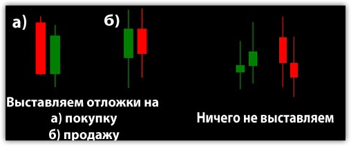 Используя нашу стратегию, мы будем один раз в сутки выставлять отложенный ордер на определенной валютной паре. Для того чтобы начать рассматривать сигналы на дневном графике должно выполнится простое условие, а именно закрыться свеча другим цветом. Для примера для продаж на дневном графике последняя свеча должна закрыться красным цветом, а предшествующая ей должна быть зеленым цветом. Для рассмотрения сигналов на покупку сигнальная свеча должна закрыться зеленым цветом, предшествующая ей должна быть красного цвета. Собственно такой подход является и фильтром направления сделки и непосредственно сигналом. Если вы имеете две в подряд красные свечи или две в подряд зеленые необходимо дожидаться появления свечи противоположного цвета и игнорировать рынок. Для наглядности мы предлагаем посмотреть картинку ниже и понять суть данного фильтра: