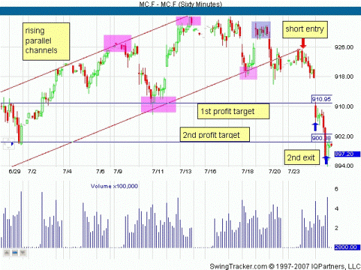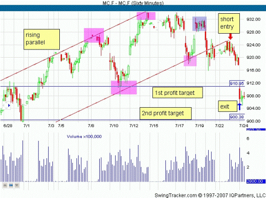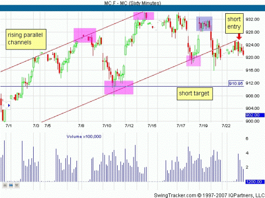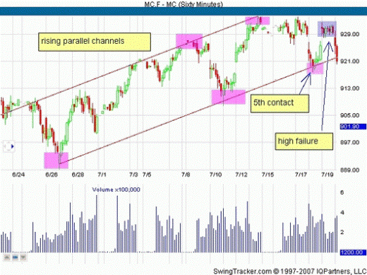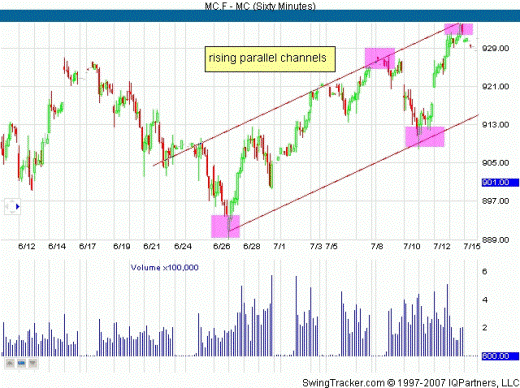 Они предоставляют трейдерам отличные способности для получения прибыли, не завися от того от где размещается в данный момент рынок в трендовом или наоборот нетрендовом состоянии, а так же на каком временном промежутке вы осуществляете торговлю. Горизонтальные каналы более известны как “торговые диапазоны” либо “консолидация” – в тех вариантах, как скоро на валютной бирже отсутствует тренд (целенаправленное перемещение кверху либо книзу). Восходящие каналы возникают на графиках, в том случае когда рынок совершает движение поступательно кверху, нисходящие каналы возникают при нисходящем тренде. Совершенно не зависимо от того, в каком состоянии в данный момент располагаться рынок - параллельные каналы видятся постоянно в разных формах и объемах. Проанализируем пример: стратегии Forex “Параллельные каналы”:В диапазоне с середины июня по начало июля 2007 года фьючерс S&P 400 MidCap E-mini перемещался на ценовом графике в восходящем канале, как наверное вы сможете наблюдать на представленном внизу часовом ценовом графике. И хотя MidCap и находился возле собственного ценового рекордного максимума, он все же торговался в большом торговом диапазоне. Синхронный канал дозволяет получить нам понятие о доли данного бокового перемещения.