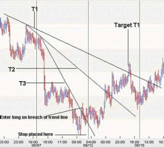 2) Потом на рынке традиционно начинает организовываться импульс, и мы после того, как он сформировался - проводим 2-ю трендовую линию (T2) сообразно причинам 2 относительно не так давно сформированных впадин. Причем нередко, мы можем с уверенностью заявить, как скоро пришло время строить трендовую линию (T2), т.к. рынок станет довольно резко передвигаться от трендовой полосы (T1). Затем, как рынок скорректируется, однако все же никак не достигнет трендовой линии (T1), настает время нарисовать следующую линию. Наш страховой стоп- ордер надлежит поставить больше самого верхнего максимума - вершины всего всходящего движения. Только после данного можно определить цель по достижению заработка - и данной целью станет трендовая линия (T1). Ежели рынок все таки обретает поддержку на предоставленной трендовой линии и начинает подниматься опять, то мы можем дожидаться, пока не образуется другая вероятность для решения короткой торговой позиции в нашем случае. Если-же цена на рынке продолжит падать через трендовую линию (T1), то этот знак считается довольно мощным показателем того, будто целый предшествующий тренд имеет направленность вполне развернуться, и мы будем обязаны разглядеть вероятность по новой войти в торговую позицию на продажу.