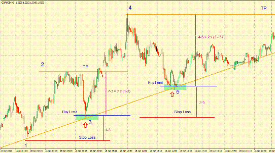 8) При приближении цены к трендовой линии, опять следует проверить соответствие предполагаемого стоп-лосса и тейк-профита. Если дистанция 3-5 меньше в 2-3 раза, чем дистанция 4-5 – следует установить в этом случае отложенный ордер на покупку – Buy-Limit. При совершении сделок на продажу существуют - обратные условия! |