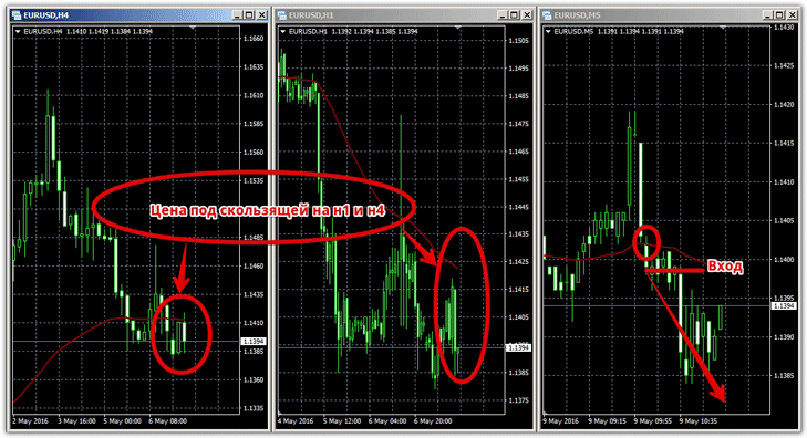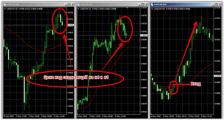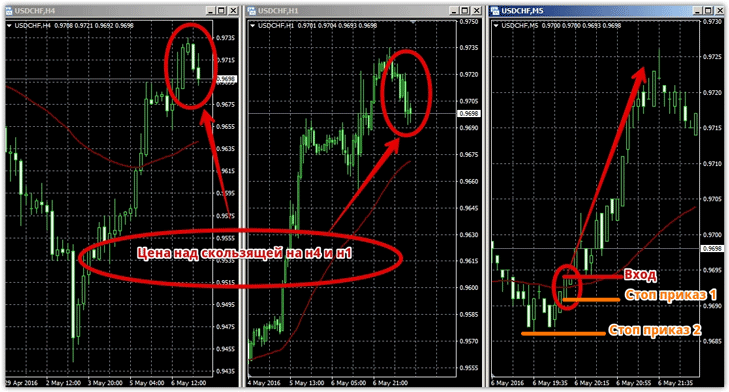 1) Первоочередной задачей является определение долгосрочной тенденции на четырех часовом графике. Для сигнала на покупку цена должна находится над скользящей средней с периодом 60, что говорит о восходящем тренде. 2) Следующим шагом является увидеть подтверждение восходящего тренда для среднесрочной тенденции на часовом графике. Для покупок цена должна находится над скользящей средней с периодом 60. 3) После определения глобальной и среднесрочной восходящей тенденции на н4 и н1 переходим на пятиминутный график и ищем точку входа, которая появляется если цена пересекла снизу вверх скользящую среднюю с периодом 60. Вход в позицию только по закрытому бару. Пример: