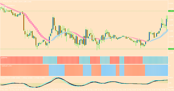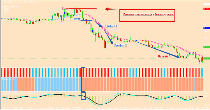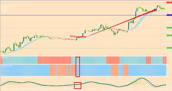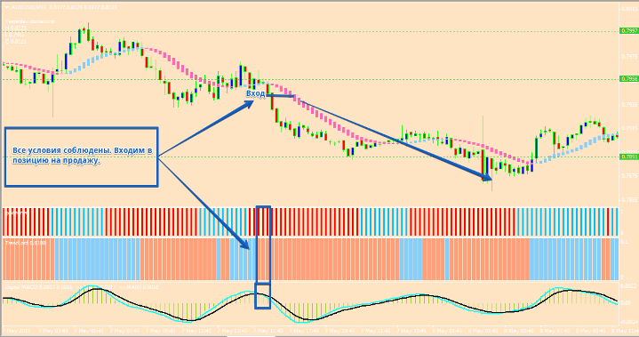 Кратко об индикаторах стратегии Торговая стратегия состоит из шести индикаторов, три из которых отвечают за фильтр тренда, один за расстановку стоп приказов и тейк профит, а так же один за вход в позицию. Теперь кратко по каждому из индикаторов: 1. HAMA – индикатор рисует бары над и под ценой голубого и розового цвета. Сам индикатор создан на основе скользящей средней и выступает в роли фильтра в стратегии. Если на рынке тренд бычий, то бар окрашивается в голубой цвет. Если бар окрашивается в розовый цвет, то на рынке медвежий тренд. Сам индикатор очень легко поддается настройке при изменении типа скользящей средней, а так же периода скользящей. Параметры могут оптимизироваться при смене тайм фрейма. 2. Фибоначчи Пивот - индикатор рисует фибо и уровни пивот. В стратегии применяется для выставления профита, а так же его передвижение по тренду. Так же вы можете ставить стоп приказ по данным уровням. 3. Goldminer – индикатор находится в первом дополнительном окне в виде баров красного и голубого цвета. В настройках можете изменять количество баров, а так же коэффициент. В стратегии выполняет функцию фильтра тренда. Бар синий – тренд бычий, бар красный – тренд медвежий. Легко поддается оптимизации. 4. Trend Lord –трендовый индикатор, который находится во втором дополнительном окне в виде баров красного и голубого цвета. Все настройки индикатора закрыты, так что вы сможете изменить только цвет линии. В стратегии выполняет функцию фильтра позиции. Если бар синий то только покупаем, а если бар красный то только продаем. 5. Digital MACD - индикатор находится в третьем дополнительном окне в виде гистограммы синего и красного цвета. По факту является модификацией стандартного индикатора MACD. В стратегии отвечает за вход в позиции при пересечении черной и голубой линии индикатора. Сигналы торговой стратегии Входим в позицию на продажу при соблюдении ряда таких условий: • В окне индикатора Digital MACD синяя линия пересекает красную линию сверху вниз. Некоторые индикаторы меняют свои показания во время движения рынка. Вход в позицию происходит только по закрытому бару. Пример входа смотрим на картинке: