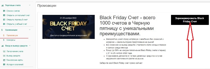 Это традиционная акция от брокера NPBFX проводимая с 21 ноября по 25 ноября 2022 года, в этот раз клиентам компании предлагаются следующие бонусы: Бонус на каждое пополнение 50% к балансу счета, которое будет осуществлено в дни проведения акции Страхование депозита от потери средств – по сути, беспрецедентное предложение, вы получаете страховку от убытков в результате неудачных сделок. А бонусом идет автоматическая страховка от банкротства брокера на сумму 20 000 евро. Узкие спреды – плата за открытие сделок отсутствует, практически полностью, отличный вариант для занятия скальпингом. Вывод прибыли без комиссии два раза в месяц, позволяет сэкономить от 1 до 4 процентов в зависимости от способа перевода денег. Акция Black Friday длятся все пять дней, количество бонусных счетов ограничено 1000, поэтому стоит поспешить и использовать уникальную возможность. Для участия в акции нужно открыть счет у брокера NPBFX - http://www.npbfx.org/ Затем в личном кабинете трейдера на страничке «Промоакции» подать заявку на участие в акции: