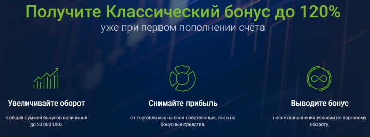 Кто то предлагает 20 процентов к пополнению, а кто то целых 50, но действительно рекордом стало предложение от компании РобоФорекс . Пройдя регистрацию на сайте брокера РобоФорекс - вы получаете уникальную возможность использовать на выбор сразу несколько бонусов: • Классический бонус при пополнении счета - 120%, зачем нужен такой бонус? Вы открываете счет и торгуете как обычно, а после выполнения условий на вашем счету оказывается + 120%, приятный подарок: