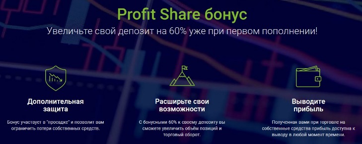Благодаря классическому бонусу можно значительно увеличить объемы открываемых позиций не прибегая к помощи кредитного плеча. • Сливаемый бонус до 60% (Profit Share), этот бонус сразу участвует в просадке и поможет помочь в некоторых стратегиях или спасти депозит при коррекции тренда: