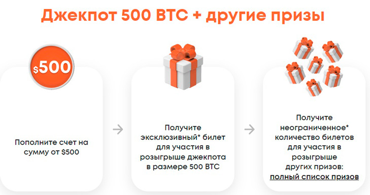 Кроме этого разыгрываются и такие призы как автомобиль Tesla Model Y стоимость 80 000 долларов и 50 iPhone 14, а так же 500 денежных призов различного размера. Для того, что бы участвовать в розыгрыше 500 Биткоинов, нужно выполнить несколько условий, в первую очередь пройти регистрацию на сайте компании ForexClub - www.fxclub.org Затем пополнить счет в компании на 50 американских долларов и получить лотерейный билет для розыграша 500 биткоинов, в случае если вы еще хотите стать участником розыгрыша автомобиля Tesla Model Y и другие призов пополнить счет нужно уже на 500 долларов США.
