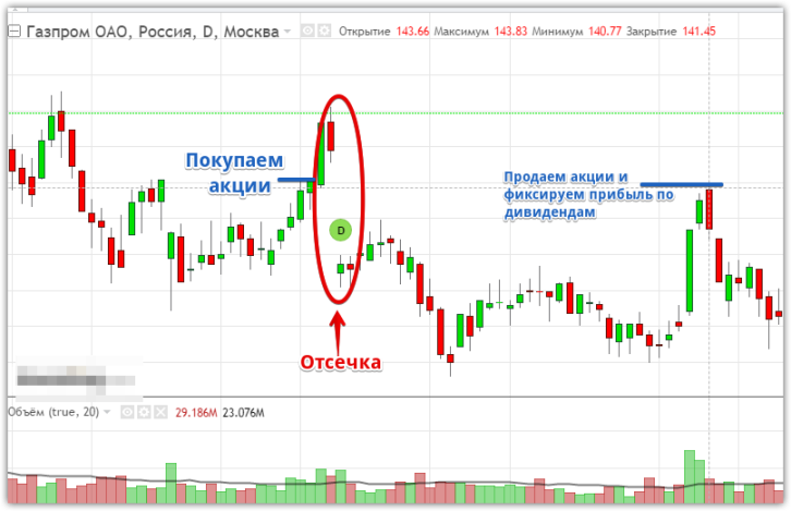 Стратегия заработка на дивидендах Погоня за дивидендами требует от трейдера применения специальных торговых тактик, которые по своей сути кардинально отличаются от привычных вариантов трейдинга. В отличие от привычных стратегий, основная цель которых сводится к заработку на разнице цены актива, дивидендные стратегии направлены на получение прибыли за счет дивидендов. Однако основная проблематика именно дивидендных торговых стратегией состоит в том, чтобы максимально обезопасить сделку и не получить огромный убыток по курсовой разнице, который будет значительно превосходить полученную прибыль по дивидендам. Собственно стоит понимать, что дивидендные стратегии рассчитаны на долгосрочных трейдеров или инвесторов. Популярные стратегии заработка на дивидендах Первая стратегия, с которой мы хотели бы начать обзор является среднесрочная тактика с окупаемостью в два три месяца. Суть этой дивидендной стратегии заключается в том, чтобы произвести покупку акций за пару дней до закрытия реестра. После закрытия реестра начинается так называемый период отсечки, когда акция после выплаты дивиденда падает в стоимости на размер дивиденда. Данная просадка, которая образуется, является рабочим моментов, а ваша цель переждать ее. После того как цена актива вернется к исходной точки следует продать акции и зафиксировать прибыль в виде дивидендов. Однако стоит понимать, что для реализации этой стратегии вам потребуется выбрать сильный актив, который склонен к постоянному росту и восстановлению. Пример подобной сделки вы можете увидеть на примере покупки акции Газпрома за пару дней до отсечки и прибыльное закрытие сделки спустя пару месяцев: