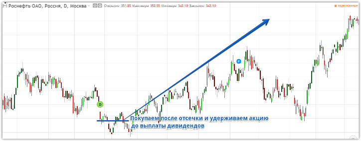 Также этот вариант позволяет максимально реинвестировать полученный доход, вовлекая в оборот все больше новых акций. Если говорить о недостатках, то стоит отметить тот факт, что вы можете выбрать неправильный актив либо попасть в черную полосу для компании, а акции так и продолжат свое падение. Вторая стратегия имеет более долгосрочный характер, а удержание акций может быть до одного года. Суть стратегии заключается в том, чтобы купить акции после отсечки и выплаты дивиденда. Именно в этот момент стоимость акции сильно падает в цене (на размер дивиденда). Однако как мы знаем компании, которые выплачивают дивиденды очень востребованы для инвестора и цена начнет свой восстановительный рост. Удержание акции может происходить до выплаты следующих дивидендов. Пример подобной сделки по акции Роснефть вы можете увидеть на изображении ниже: