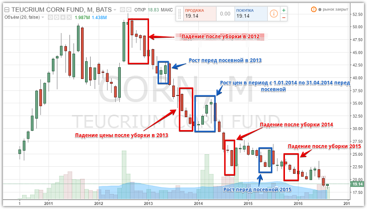 Статистика цен на сх фьючерсы Спрос и предложение – это самый главный ключевой фактор, который движет ценами на рынках. Причем вне зависимости товарная это биржа или фьючерсная, пока будут покупатели, продавцы цена всегда будет в активном движении. Нарушение баланса между покупателем и продавцами всегда выражается в виде восходящего или нисходящего всплеска цены. Принято считать, что фьючерсы на сельскохозяйственную продукцию, особенно зерновая группа, очень сильно зависят от спроса и предложения, причем, как правило, это выражается в сезонности движения цены актива. Так, многие трейдеры убеждены, что зерновые фьючерсы опускаются к минимумам своих цен в момент убора урожая и в первый месяц после уборки, а также обновляют свои максимумы в дальнейшие месяцы, особенно ближе к новой посевной. Собственно если посмотреть с логической точки зрения, то в данных домыслах есть рациональное зерно, ведь в момент, когда все фермеры убрали свой урожай рынок перенасыщен продукцией, что приводит к естественному снижению цен из-за высокой конкуренции между хозяйствами, а также нехватки покупателей. Ближе к новой посевной на рынке происходит нехватка товара, а также добавляются дополнительные затраты на хранение и просушку зерна на зерноэлеваторах. Обо всех этих фактах давно известно, но так ли это на самом деле? Возможно ли заработать на сезонных изменениях цены используя простую закономерность? Цель данной статьи сделать исследование основных зерновых фьючерсов за двухлетний период. Закономерность изменения цены по фьючерсу на кукурузу (Corn) Лидером и главнейшим экспортером кукурузы является США, поэтому от даты сбора и посева урожая именно этой странны, зависит ценовое изменение фьючерса на кукурузу. Посевная компания в США как правило начинается в средине апреля и заканчивается в средине мая. Уборка происходит в начале сентября и заканчивается в октябре в зависимости от сорта. Исходя из посевной компании, которая происходит в США можно предположить, что цена на данный фьючерс будет возрастать в начале февраля и активный свой пик возьмет ближе к маю, поскольку на рынке будет дефицит данного товара. Ближе к сентябрю месяца начнется снижение фьючерса Corn вследствие первых данных по уборке урожая, а к октябрю и ноябрю рынок должен быть переполнен и цена должна обновить свои минимумы. Собственно чтобы понять так ли это на самом деле предлагаем познакомится с месячным графиком фьючерса на кукурузу на котором отмечены данные периоды:
