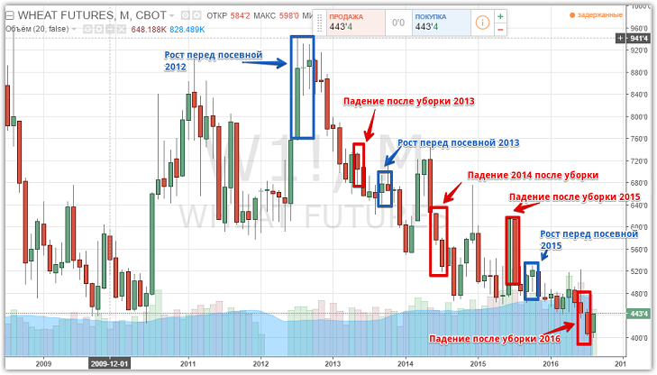 Такая же тенденция с продолжительностью два три месяца продолжалась вплоть до 2015 года. Отсюда можно сделать вывод, что фьючерс на кукурузу действительно зависим от сезона, а именно уборки и посевной. Однако стоит заметить, что данная закономерность работает циклами в 2-3 месяца, а не как об этом пишут в учебниках и различных биржевых журналах. Закономерность изменения цены по фьючерсу на Пшеницу (Wheat) Главными лидерами по выращиванию пшеницы на сегодняшний день являются пост советские страны, а именно Украина и Россия. На втором месте после стран бывшего советского лагеря стоит США. Стоит отметить, что на экспорт идет в основном озимая пшеница, поскольку яровая остается на местные нужды, а ее объемы очень незначительные. Как правило, высев культуры происходит в сентябре месяца, а уборка в мае, июне, июле в зависимости от страны и климатической зоны в которой она выращивается. Исходя из закономерностей сезонности движения зерновых фьючерсов, можно предположить, что в момент уборки, а именно в июне, июле месяце должно происходить перенасыщение рынка, а как следствие падение цены фьючерса. В момент посевной, а именно в сентябре, октябре на рынке происходит нехватка товара, поэтому в этот период цена должна принимать восходящую тенденцию. Чтобы понять так ли это на самом деле предлагаем посмотреть график ниже: