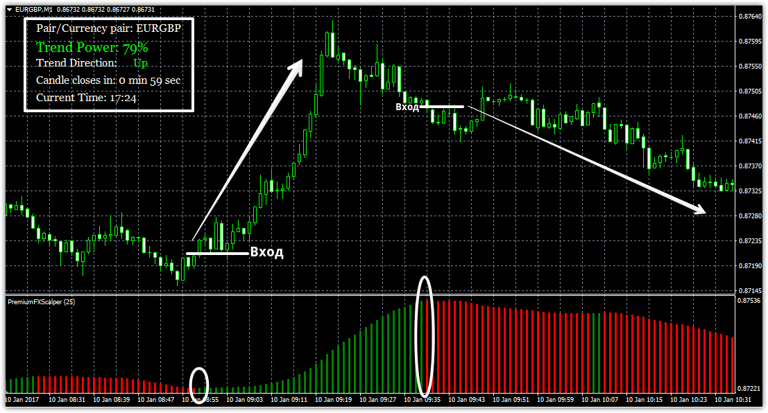 Практичное применение Scalper Dream Индикатор Scalper Dream выполнен в виде двухцветной гистограммы. Так зеленый цвет гистограммы указывает нам на наличие восходящей тенденции, а красный на наличие нисходящей. Исходя из этого, если вы используете Scalper Dream в качестве фильтра, вы можете входить на покупки, только если гистограмма зеленая, а на продажу, только если гистограмма красная. Если применять инструмент в качестве сигнального индикатора то вход происходит при смене тенденции, а именно входим на покупку при смене красного цвета гистограммы на зеленый, а на продажу при смене цвета гистограммы с зеленого на красный.