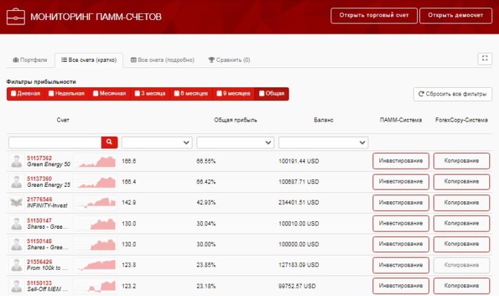 Для начала инвестиций нужно самостоятельно выбрать своего управляющего, при этом начальная сумма вложений может начинаться от 1 доллара, а средняя прибыльность от 5 до 50 процентов. Каждый управляющий самостоятельно указывает в условиях, как будет распределяться полученная прибыль, но как правило, это половина или 60%. Стать управляющим можно имея на счету буквально пару долларов, в то же время максимальная сумма инвестиций составила почти пол миллиона долларов. Сайт компании ИнстаФорекс - instaforex.com  |