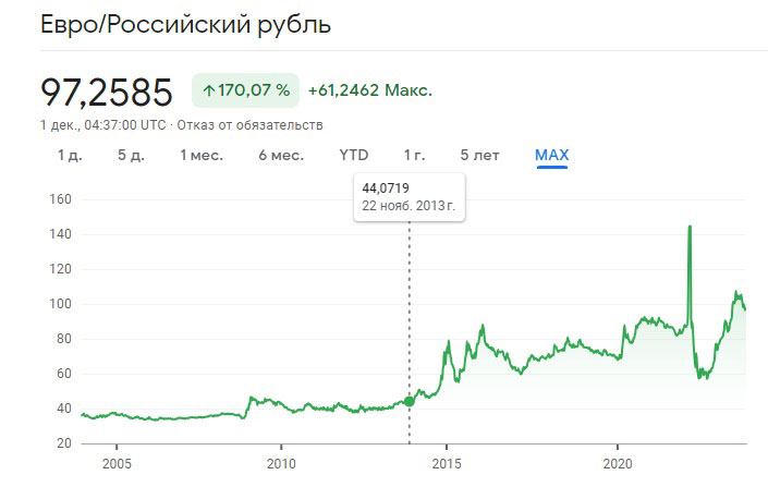Для примера рассмотрим депозит в евро по 3% годовых и планируемый доход в 3000 евро или 250 евро в месяц, такой суммы достаточно для того что бы выжить в большинстве постсоветских стран. Необходимая сумма депозита для получения прибыли 250 евро в месяц составляет около 110 000 евро, так как следует учесть и налог по вкладам, который взимается практически в любой стране. То есть, имея на счету 110 000 евро вы будете получать сумму, которой хватит только на погашение коммунальных платежей и самые необходимые расходы. Если хранить деньги в национальной валюте?На первый взгляд картина становится более интересной, взять, к примеру, российский рубль: 110 000 евро это сегодня 11 000 000 российских рублей при процентной ставке в 15% удастся получить с учетом налогов - 1 435 000 или 120 000 рублей в месяц. Сумма в 5 раз больше чем, если хранить эти деньги в евро, но вспомните, сколько стоил евро 10 лет назад?