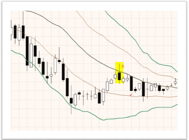 Правила открытия позиции на продажу: • Цена минимум 10 свечей находится под серединной полосой Bollinger Bands.