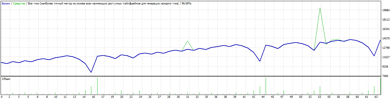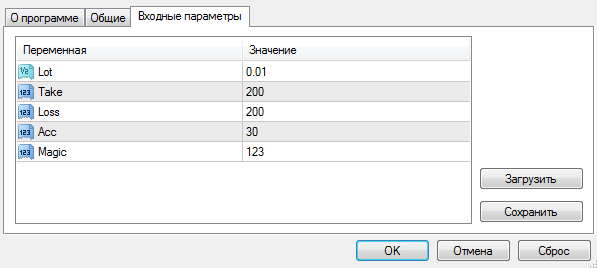 Стратегия. Настройки Как уже отмечалось, советник не использует никаких индикаторов в своей основе. Так, робот измеряет направленную скорость движения цены в тиках и сравнивает ее с той, которая внесена непосредственно в настройках. В случае если скорость движения цены оказывается выше, чем указана в настройках, происходит открытие позиции рыночным ордером с заданным профитом и стопом, которые равны друг другу в пунктах. В случае если позиция закрывается с убытком, эксперт дожидается нового ценового импульса и открывает позицию удвоенным лотом. Удвоение лота происходит до тех пор, пока советник не перекроет убытки и не выйдет в плюс после серии закрытых ранее убыточных ордеров.
