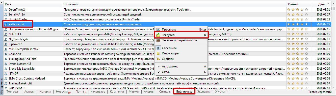 Лучший брокер 2026 года. Советник Patterns EA – это уникальный торговый робот для торгового терминала МТ5, который позволяет протестировать и автоматизировать торговлю по тридцати различным паттернам свечного анализа. Примечательной особенностью Patterns EA является его гибкая система настроек, которая позволяет отключать или включать различные паттерны, причем существует возможность работать с группами, которые разбиты по сложности. Patterns EA, как и свечной анализ в целом не имеет никакой привязки к валютной паре или тайм фрейму, поэтому робот можно оптимизировать под любые условия рынка, причем огромнейшее количество паттернов позволяет находить прибыльные комбинации без особого труда. Установка советника Patterns EA Советник Patterns EA разрабатывался с целью тестирования свечных паттернов, проверки их эффективности на истории. Поэтому робот был распространён на бесплатной основе, более того, как утверждает сам автор, его разработку опубликовали в официальной библиотеке метатрейдер 5 с учебной целью. Таким образом, Patterns EA вы можете установить двумя способами, а именно либо через библиотеку, либо по стандартной схеме через каталог данных. Для установки советника через библиотеку произведите запуск вашего торгового терминала МТ5 и переместите свое внимание на панель «инструменты», где еще находится актуальная информация по вашему балансу. Следующим шагом вам потребуется переместиться во вкладку «Библиотека» и произвести сортировку полученного списка с целью отображения только советников, без индикаторов и скриптов. После того как вы найдете в списке Patterns EA произведите его загрузку с помощью дополнительного меню как это показано на изображении ниже:
