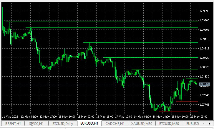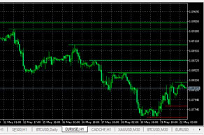 Расчет значимых уровней производится на основании данных технического анализа, именно они служат базой для построения линий поддержки и сопротивления. Последнее время все графические построения в торговой платформе автоматизированы с помощью индикаторов, которые работают на базе заложенных алгоритмов. Сегодня мы представляем один из подобных инструментов под названием «Resistance Support Lines» его отличием от аналогичных сриптов является то, что он строит, психологические уровни. После того как вы скачаете индикатор в конце данной статьи или на Маркете МТ5 и установите на график торговой платформы metatrader 5 инструмент автоматически построит уровни поддержки и сопротивления: