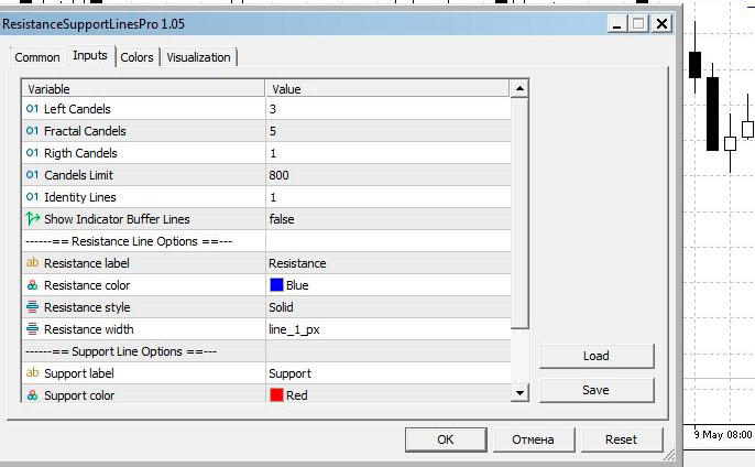 Автор разработал два варианта индикатора Resistance Support Lines, один совершенно бесплатный с настройками по умолчанию, и другой за 35 долларов в котором можно сменить такие настройки: Fractal Candels = 5 – базовое количество таймфреймов, которые используются при расчете психологических уровней цены, расчет производится по минимумам и максимумам Rigth Candels = 1 - количество таймфреймов на базе которых происходит фильтрация ложных фракталов с левой стороны Left Candels = 3 - количество таймфреймов на базе которых происходит фильтрация ложных фракталов с правой стороны Candels Limit = 400 – общее количество таймпреймов участвующих в расчётах индикатора Identity Lines = 2 – параметр задающий расстояние между одинаковыми линиями, позволяет исключить лишние линии с практически одинаковой ценой.