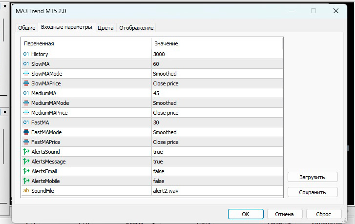 Работа скрипта отображается в виде трех скользящих средних разных оттенков, меняющих цвет в зависимости от направления тренда. Сигналами на покупку можно считать – смена цвета линий на синий и расхождение линий в разные стороны. Сделка закрывается, когда намечается тенденция на сближение линий. Сигналами на продажу являются – появление красных линии, которые начинают расходиться в разные стороны. Закрытие позиции, так же, лучше производить при уменьшении расстояния между красными линиями. Если вы проанализируете историю, то увидите, что желательно не дожидаться когда сменится цвет линий, а закрывать сделку еще до этого момента. Если говорить о настройках, то перед установкой трендового индикатора вы можете изменить следующие настройки: