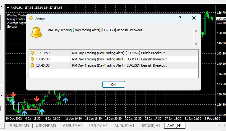 Кроме цветовой гаммы выводимых на экран данных и настройки диапазонов, так же доступно включение подачи сигналов на открытие сделок, после чего вы буде получать сообщения как в торговой платформе МТ4 так и на электронную почту. Сообщение о новом событии на графике выглядит следующим образом: