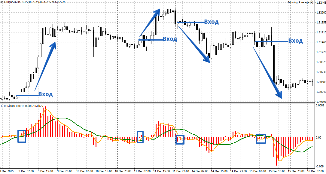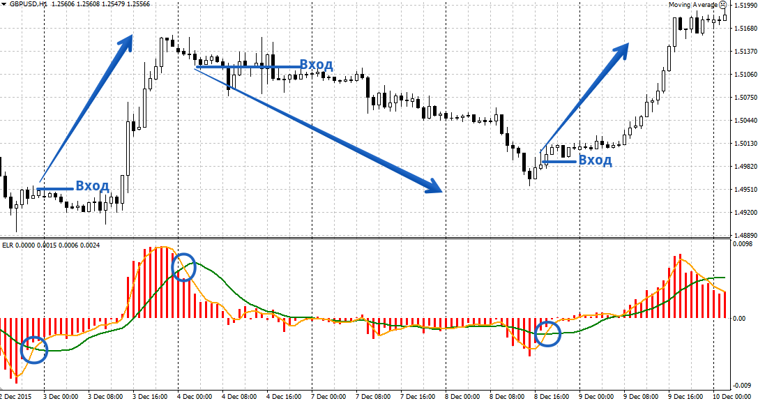 Практическое применение. Сигналы Индикатор лучи Элдера выполнен в виде гистограммы, с двумя сигнальными линиями. Так верхняя часть гистограммы, которая находится над уровнем 0, отображает силу быков, а нижняя часть гистограммы отображает силу медведей. В случае, когда сила быков пересиливает силу медведей, происходит пересечение нулевой линии снизу вверх, что является отличным сигналом на покупку. Если сила медведей начинает пересиливать силу быков, происходит пресечение уровня 0 сверху вниз, что является отличным сигналом на продажу. Более детально смотрим ниже: