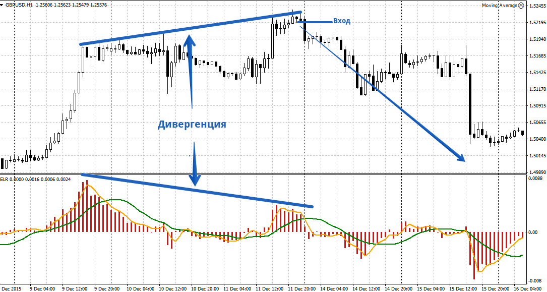 Стоит напомнить, что дивергенция – это расхождение показаний индикатора с реальной ценой. В качестве примера вы можете наблюдать такую ситуацию, когда цена обновила новый максимум, а индикатор отображает его ниже предыдущего, что является сильным сигналом к развороту восходящего движения. В случае если цена обновила минимум, а индикатор отобразил что данный минимум выше предыдущего – на рынке произойдет разворот наверх. Пример дивергенции сморим на изображении ниже: