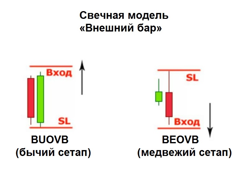 Основные паттерны Price Action Количество паттернов Price Action, которые присутствуют в классической методологии, переваливает за десять. Не все из них обрели популярность у трейдеров. Многие в работе используют всего пару самых популярных свечных формаций, показавших высокий уровень отработки сигналов. Рассмотрим самые распространенные сетапы, вероятность получения прибыли по которым наиболее велика. Внешний бар (BUOVB или BEOVB) Свечная модель «Внешний бар» считается разворотной и возникает при смене одной тенденции на другую. Для нее характерно наличие двух разнонаправленных свечей. Первая продолжает тренд. При наличии восходящей тенденции она должна иметь восходящую направленность и наоборот при нисходящей. Тело второй свечи полностью поглощает как тело, так и тень первой. Она направлена вниз при текущем восходящем тренде либо вверх при нисходящем. Пример «бычьей» и «медвежьей» свечной модели показан на рисунке ниже.