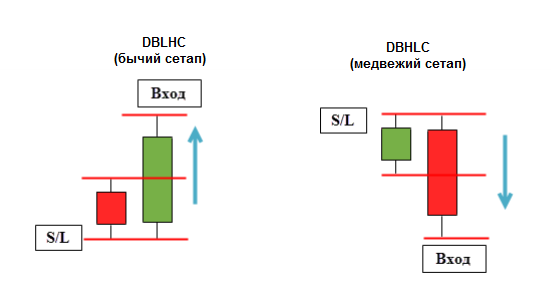 Паттерны Price Action DBLHC и DBHLCПризнаком следующих паттернов в методологии Прайс Экшн являются одинаковые максимумы (DBHLC) и минимумы (DBLHC) двух свечей, расположенных рядом. При этом размер первой должен быть в два раза меньше величины второй.