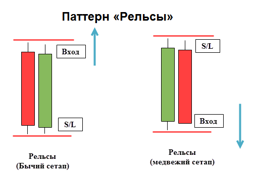 Паттерн «Рельсы» Свечная модель «Рельсы» состоит из двух примерно одинаковых по размеру разнонаправленных свечей. Ее возникновение на сильном уровне предполагает разворот рынка. Направление первой свечи соответствует текущей тенденции. Вторая свеча направлена в противоположную сторону. Пример на рисунке ниже.