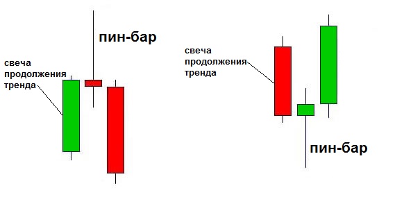 К категории основных паттернов Price Action можно отнести разворотную модель Пин-бар. Формация включает в себя три свечи, но допускается к торговле при формировании двух. Во время образования третьей нужно входить в рынок. Первая свеча продолжает существующий тренд.