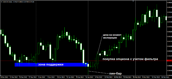 Правила входа в рынок price action для опционов.Самый высокий уровень отработки сигналов наблюдается по разворотным свечным моделям. После пробития формации цена финансового актива зачастую двигается резко и импульсивно. Этот нюанс и нужно использовать в торговле бинарными опционами. Однонаправленное движение цены является признаком качественного сигнала. Лучший брокер 2026 года. Не рекомендуется торговать бинарными опционами по методу Price Action на графиках, меньше часового периода. Лучше использовать старшие таймфреймы. Точность сигналов на них будет выше. Срок экспирации опциона обычно не превышает одну-две свечи. В дальнейшем пара может пойти на коррекцию. Если вы входите в рынок на середине свечи, срок экспирации лучше выбирать к закрытию следующей. Не покупайте опцион в момент пробоя ценой сигнального уровня. Установите фильтр в несколько пунктов, которые должна пройти цена, прежде чем вы войдете в рынок. Для дневного графика эта величина равна 15-20 пунктам, для часового — 5-10. Примеры сетапов по стратегии Price Action для бинарных опционов На рисунке ниже изображен пример использования методологии PriceAction для бинарных опционов. Сетап появился на дневном графике, что само по себе хорошо, поскольку риск возникновения «рыночного шума» на старших таймфреймах минимален. Цена валютной пары образовала сильную зону поддержки (скопление минимумов), что видно на графике финансового инструмента, слева от сигнальной свечи. Пин-бар обладает всеми признаками качественной свечной модели — короткое тело, длинная тень, выступающая далеко вниз за предыдущие свечи. Пробитие максимума пин-бара является сигналом на покупку опциона Call со сроком экспирации, который приходится на момент закрытия последующей после пробоя свечи. На рисунке ниже можно еще раз убедиться в важности фильтра. После пин-бара образовалось несколько свечей, чей максимум всего на несколько пунктов выше максимума сигнальной свечи. Поскольку покупка опциона допустима лишь после прохождения ценой 15-20 пунктов от цены пробития, сигнал оказался прибыльным. Последующая свеча закрылась значительно выше той, которая пробила максимум пин-бара с учетом фильтра.