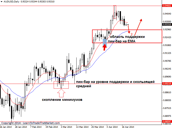 Методика анализа рынка Price Action от Нила Фуллера Нил Фуллер — один из самых популярных последователей системы Price Action, автор ресурса в Интернете, на котором он делится результатами своих трудов по изучению поведения цены финансового инструмента. Известный тренер, обучающий торговле на рынке Форекс на чистом графике. В чем заключается его подход? Основные моменты технологии PriceAction по Нилу Фуллеру Нил Фуллер рекомендует использовать тайм фреймы от часового и выше в качестве главного рабочего периода. Его подход направлен на поиск паттернов PriceAction в местах слияния сильных уровней, при этом он опирается не только на классическую горизонтальную поддержку или сопротивление. Идентификация сильного сигнала по Нилу Фуллеру происходит на основании следующих критериев: • паттерн PriceAction предполагает продолжение существующего тренда; • свечная модель опирается на горизонтальный уровень поддержки или сопротивления; • цена пробила или отбилась от одной из пар экспоненциальных скользящих средних — ЕМА 8 и ЕМА 21 или ЕМА 150 и ЕМА 365; • паттерн возник на отбое от 50% уровня коррекции. В технологии анализа рынка по Нилу Фуллеру используется индикатор Exponential Moving Average в качестве поддержки или сопротивления, а также для определения силы тренда. Чем больше угол наклона скользящих средних, тем сильнее тенденция. Подход базируется на утверждении, что цена движется вокруг среднего значения, периодически устремляясь к нему. Для часового графика валютной пары Нил Фуллер использует ЕМА с периодами 150 и 365. На дневной наносит ЕМА 8 и ЕМА 21. Рассмотрим пример качественного сигнала по методике Нила. На рисунке ниже изображен дневной график пары AUD/USD. Наклон скользящих средних говорит о сильной восходящей тенденции. Первый пин-бар формируется в области поддержки (скопления минимумов цены в прошлом) и на скользящей средней. Слияние горизонтального уровня и отбой от ЕМА увеличивают силу паттерна. Как видно из истории, восходящий тренд продолжился. Второй пин-бар также отбился от скользящей средней, образовав тем самым область поддержки, куда потом будет стремится цена после образования последнего пин-бара на вершине тренда.