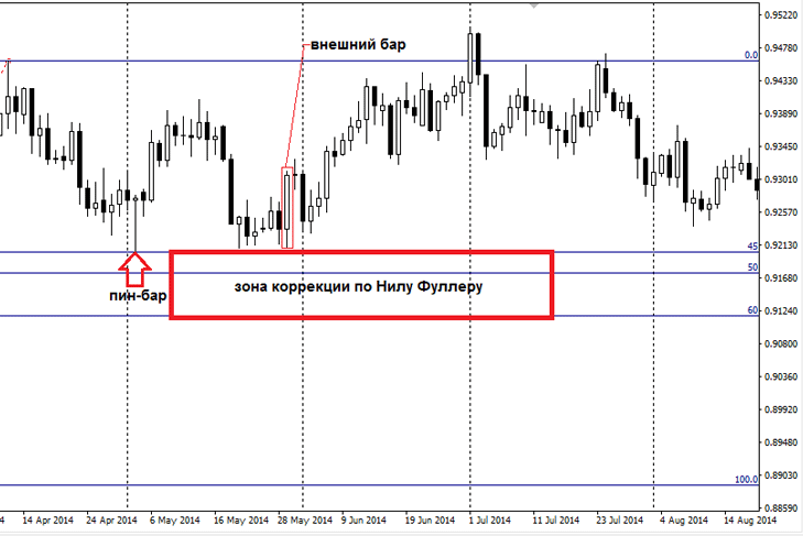 Следующий принцип торговли по методу Price Actionот Нила Фуллера заключается в правиле отката на 50% от величины предыдущего движения. Автор точно не придерживается обозначенной цифры. Он ищет паттерны PriceAction в пределах между уровнями 45 и 60%. На примере ниже показан пример сигнала на вход по тренду от коррекции 45%. На этом уровне сразу образовался пин-бар, после пробития которого последовал рост. Затем здесь же сформировался внешний бар, давший начало новой волне восходящего движения.