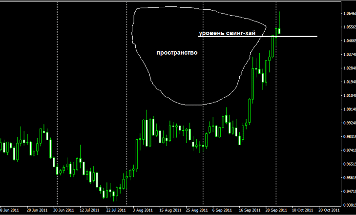 Если вы испытываете затруднения, посмотрите на пространство слева от графика пары. Если вы там видите пустоту, значит уровень можно смело отнести к свингам. Пример изображен на рисунке ниже.