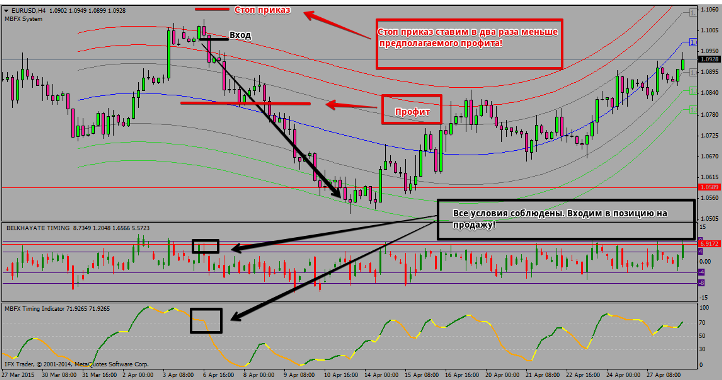 Установка стоп приказа. Выход с позиции При работе со стратегией очень тяжело проставлять стоп ордера. Как учат классики, стоп нужно ставить на локальных минимумах и максимумах, важных уровнях. Но в нашем случае это практически не возможно из-за того что мы очень часто будем входить в рынок практически на пике. Профит мы будем ставить на уровне центральной синей линии. Стоп приказ я рекомендую ставить в 2 раза меньше возможного профита. Например, если до ближайшей цели 50 пунктов, то ваш стоп приказ должен составить 25 пунктов. Пример входа постановки стоп приказа смотрим на картинке:
