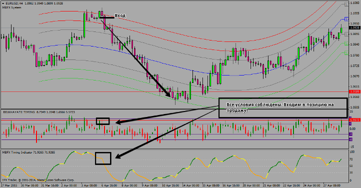 Для входа в позицию на продажу, должен соблюдаться ряд таких условий: 1. Цена должна находиться между двух красных линий у верхней границы канала. Так же цена может отталкиваться от крайней красной линии. Оба сигнала правильны.
