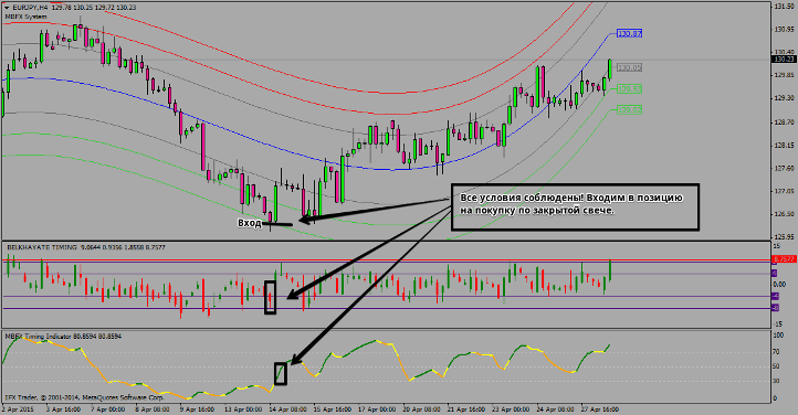 Кратко о принципах работы стратегии, индикаторов Стратегия состоит из трех индикаторов, два из которых отвечают за вход в позицию, а третий в качестве фильтра. Суть стратегии состоит в том, что цена всегда стремится к центральной линии синего цвета, обладающая магическим числом 1.6180. А теперь кратко об индикаторах: Условия для открытия позиции Для входа в позицию на покупку, должен соблюдаться ряд таких условий: 1. Цена должна находиться между двух зеленых линий у нижней границы канала. Так же цена может отталкиваться от крайней красной линии. Оба сигнала правильны.