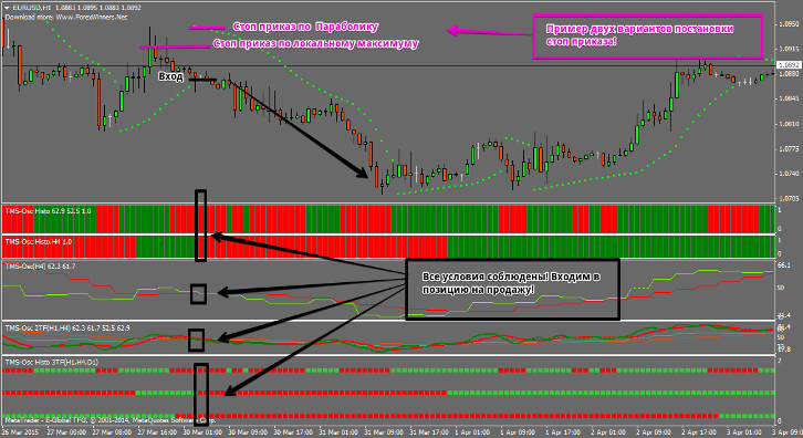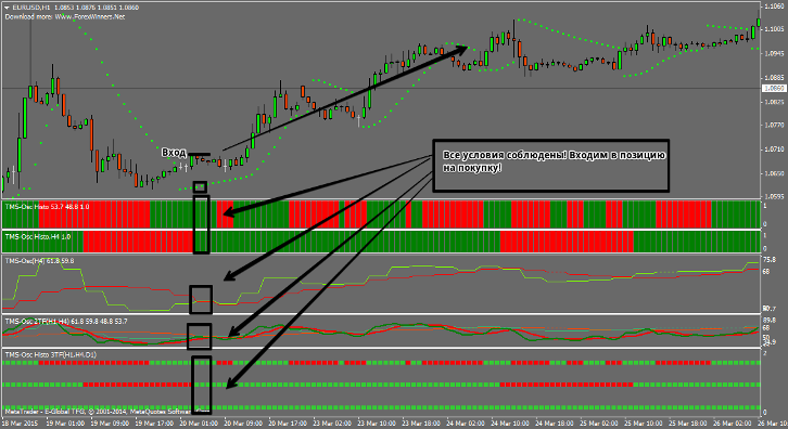 Общие данные, составляющие стратегии Торговая стратегия создана на основе четырех осцилляторов и одного трендового индикатора. Торговать с помощью ее можно на любой валютной паре, включая металлы и акции. Рабочий тайм фрейм от м30 до н4. А теперь давайте разберем каждый индикатор: 1. Parabolic SAR – многофункциональный трендовый индикатор, который присутствует по умолчанию в любом терминале, включая МТ4. На графике отображается в виде зеленых точек над и под ценой. В стратегии выполняет две функции, а именно фильтр тренда и постановка стоп приказов. 2. Tms Osc Histo – находится в первой дополнительной рабочей области в виде баров зеленого и красного цвета. В стратегии отвечает за фильтр тренда. Если бар красного цвета – на рынке медвежий тренд, а если зеленого – бычий. В реальности является обычным графически измененным осциллятором RSI. 3. Tms Osc – находится во втором дополнительном окне в виде линий красного и зеленого цвета. Является очередной модификацией стандартного индикатора RSI. В стратегии выполняет сигнальную функцию. 4. Tms Osc 2TF – индикатор является аналогом предыдущего индикатора, но в сваем составе имеет четыре линии. Может отвечать как за вход в позицию, так и за выход. Настройки можно изменять как у стандартного RSI. 5. Tms Osc Histo 3tf - находится в четвертом дополнительном окне в виде баров красного и зеленого цвета. Обратно же является аналогом Tms Osc Histo, отличаясь лишь количеством индикаторов rsi. В стратегии выполняет функцию фильтра, как и его аналог. Сигналы на вход в позицию Для входа в позицию на покупку должен соблюдаться перечень таких условий: • Точка индикатора Parabolic SAR должна находится под ценой. Хочу предупредить, что индикатор Rsi чувствительно реагирует на колебания цены, поэтому входим в позицию только по закрытой свече. Пример входа смотрим на картинке: