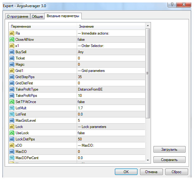 Если вы хотите чтобы ArgoAverager сопровождал сделки за определенным советником, то укажите его Magic номер в параметре Magic. Также вы можете поставить сопровождение определенного ордера открытого вручную. Для этого укажите в строке настроек Ticket номер ордера. Помимо выбора сопровождения ордеров вы можете настраивать непосредственно само усреднение. Так в параметре GridStepPips вы можете задавать дистанцию в пунктах между ордерами сетки, а в GridDistFirst отступ от первого ордера. Функция DistanceFromBE позволяет выставить размер профита в пунктах от безубытка серии открытых ордеров. Строка LotMult позволяет установить коэффициент усреднения, а благодаря функции MaxGridLevel вы можете указывать максимальное количество ордеров сетки усреднения. В заключение хотелось бы отметить, что ArgoAverager является отличным помощником, который способен вывести ваше усреднение в торговле на форекс совершенно на новый профессиональный уровень. Скачать советник ArgoAverager |