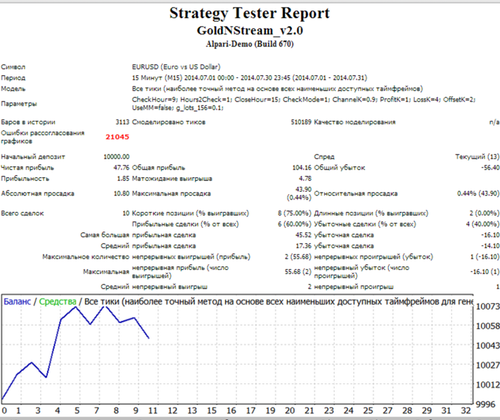 Gold N Stream.Советник использующий стратегию торговли на пробое и уже принесший не мало прибыли трейдерам. GoldNStream - появился еще в 2008 году, кто то скажет, что за это время рынок изменился, это да, но не изменились общие принципы движения цены. Работа скрипта основана на следующем алгоритме действий - раз в сутки он измеряет ширина существующего ценового канала, а после его пробоя открывает сделку, при этом выставляются все необходимые ордера. Лучший брокер 2026 года. В первую очередь следует отметить, что советник GoldNStream вполне рабочий, нормально запускается как на тестере, так и на реальном счете, а это уже хорошо. Возникли непонятные моменты с работой самого тестера, причем на терминалах от разных брокеров, поэтому нельзя сказать за объективность тестирования. За месяц тестирования советник форекс показал всего 0,5% прибыли, возможно причиной этому стала проблема с архивом котировок, но все же прибыль есть.