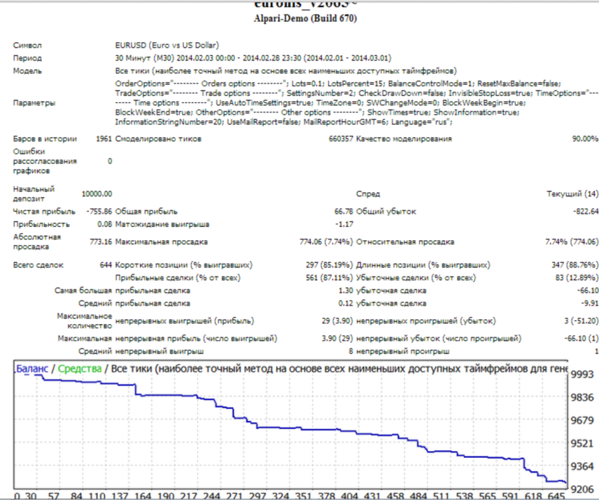 Тестирование советника euronisВ течении нескольких часов Euronis был протестирован на предлагаемых валютных парах и разных временных промежутках с помощью тестера стратегий. В некоторых случаях он уверенно сливал депозит, в других терял по 20-30 процентов за месяц.