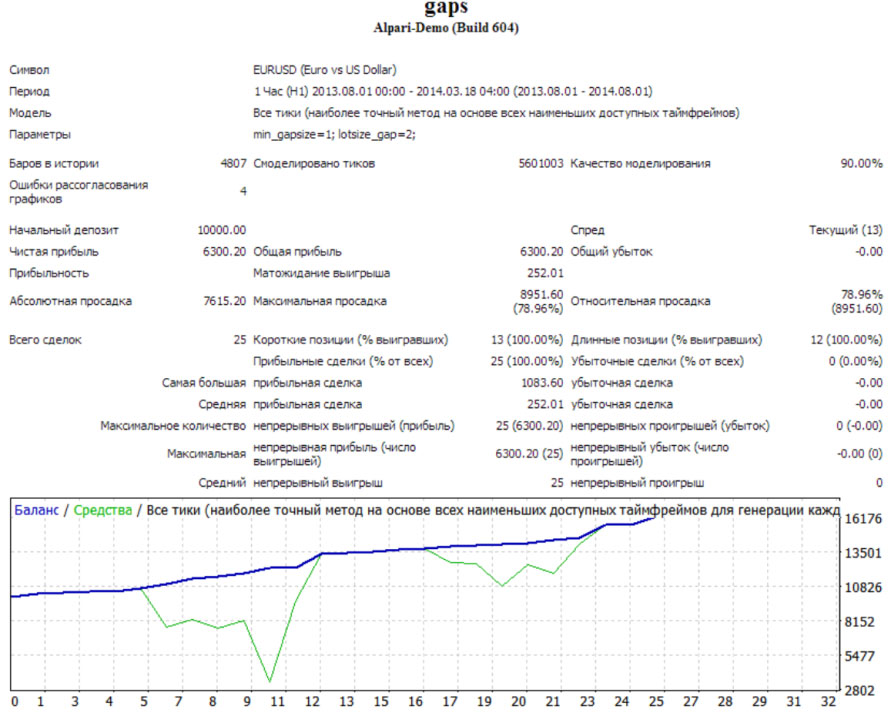 Советник гэп.На ценовых разрывах построена масса различных стратегий, причем большинство из них являются довольно прибыльными, подобный факт послужил основанием для создания одноименного советника для автоматической торговли. Советник гэп - является одним из менее рискованных вариантов автоматического трейдинга, сделки открываются только при наличии существенных ценовых разрывов и явной тенденции к их заполнению. Тестирование советника для торговле во время гэп.Тест проводился на нескольких временных промежутках и валютных парах, депозит 10000 долларов, в результате удалось выяснить: