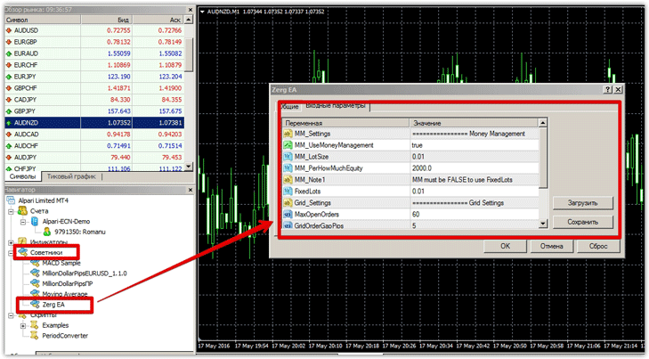 Стратегия торговли советника Zerg. Настройки Разработчики эксперта внедрили довольно простую стратегию, однако в тоже время очень эффективную. Так, советник Zerg открывает позицию по авторскому индикатору, однако в случае если цена идет не в сторону профита, эксперт начинает выстраивать сеть ордеров на определенном расстоянии друг от друга со статическим лотом, что позволяет уменьшить сильно просадки. Поскольку валютная пара AUD/NZD имеет широкие откаты в 100 и более пунктов советник, без каких либо рисков закрывает позиции в плюс. Стоит также отметить, что в советнике присутствует стоп приказ, поэтому если вы попадете на сильный тренд советник никогда не сольет счет полностью, а обрежет все убытки. В советнике Zerg есть возможность включить или отключить динамический лот. По умолчанию советник работает с динамичным лотом, при этом вы можете его менять. Для этого укажите в строке MM LotSize размер лота на базовую суму депозита, которая указана в строке MM PerHowMuchEquity. Если вы отключите динамичный лот в строке MM UseMoneyManagement, то вам необходимо задать статический лот в строке FixedLots. Также в советнике присутствуют настройки для самой сетки. Так в строке MaxOpenOrders вы можете ограничить максимальное количество одновременно открытых ордеров, а в строке GridOrderGapPips задать расстояние между ордерами сетки. В строке StopLoss задается уровень стоп приказа для ордеров, а в строке MagicNumber задается уникальный код, благодаря которому советник не трогает чужие ордера кроме своих. Тестирование на истории советника ZergПри тестировании советника очень важно обратить внимание на размер спеда, поскольку, как известно кросс курсы имеют очень высокую комиссию. Так для примера брокер Инстафорекс, у которого спред по AUD/NZD составляет 12 пунктов совершенно не подходит, а вот Альпари имеет 4 пункта, что является приемлемым. В виду того что советник создан для работы с четырехзначными котировками мы в строках StopLoss, GridOrderGapPips произвели умножение на 10. Результат по AUD/NZD за 2015 год: