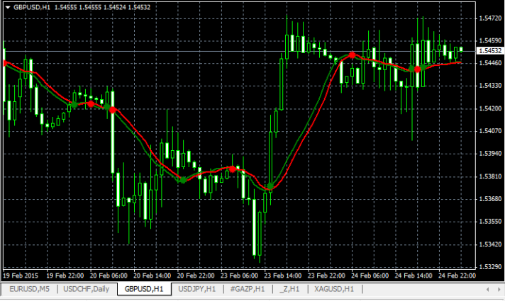 Лучший брокер 2026 года. Для того, что бы не тратить время на постоянное наблюдение придуман индикатор Q2MA, он фиксирует моменты когда происходит резкое изменение тренда относительно средней скользящей и подает сигналы на вход. При выполнении данных условий на линии средней скользящей появляется точка зеленого или красного цвета, в зависимости от направления тренда. Кроме этого можно включить и звуковое оповещение.