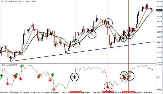 Изменение цены отмечаются стрелками разного цвета, эти точки являются сигналами на открытии ордеров, или закрытие убыточных позиций. |