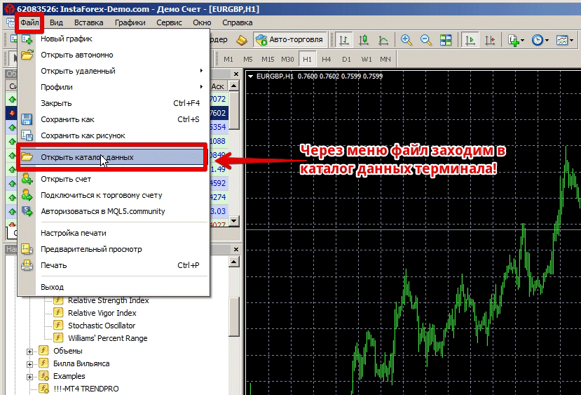 Конечно, вы можете пойти путем нанесения каждого индикатора по отдельности, однако это займет довольно много времени. Кроме этого, стоит забывать, что каждый автор стратегии ее визуализирует, поэтому при самостоятельном нанесении индикаторов на график визуальное отображение может быть не таким приятным, как это сделано в авторском варианте. Поэтому чтобы упростить себе жизнь давайте познакомимся с инструкцией как установить шаблон в торговую платформу. Процесс установки шаблона довольно прост. Для этого вам понадобится ваш торговый терминал и шаблон стратегии. Стоит отметить, что одной установки шаблона для запуска стратегии недостаточно, поэтому в вашем терминале должны быть предварительно установлены индикаторы. Итак, что бы установить шаблон вам необходимо скопировать файл шаблона (имеет расширение файла в названии tpl) и поместить в папку вашего терминала под названием Template. В деталях: 1) Заходим в меню файл вашей торговой платформы и открываем каталог данных.