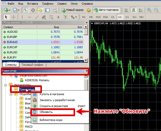 После установки шаблона необходимо обновить данные в торговой платформе МТ4 для того что бы он мог увидеть вашу инсталляцию. Для этого существует два пути: 1) Просто перезапустите торговую платформу. 2) Не перезапуская торговую платформу войдите в панель «Навигатор» и возле индикаторов и советников правой кнопкой мыши вызовите дополнительное меню и нажмите «Обновить»