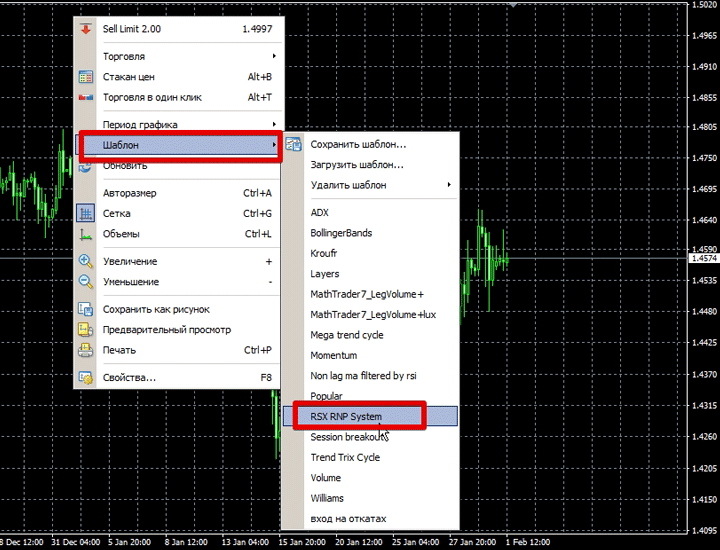 Как запустить установленный шаблон в МТ4 В процессе запуска только установленного шаблона нет ничего сложного. Для этого на графике правой кнопкой мыши вызываем дополнительное меню и находим строку «Шаблон». После того как вы наведете на ее курсором мышки перед вами появится список установленных шаблонов. Выбираем на нужный нам шаблон и запускаем его.